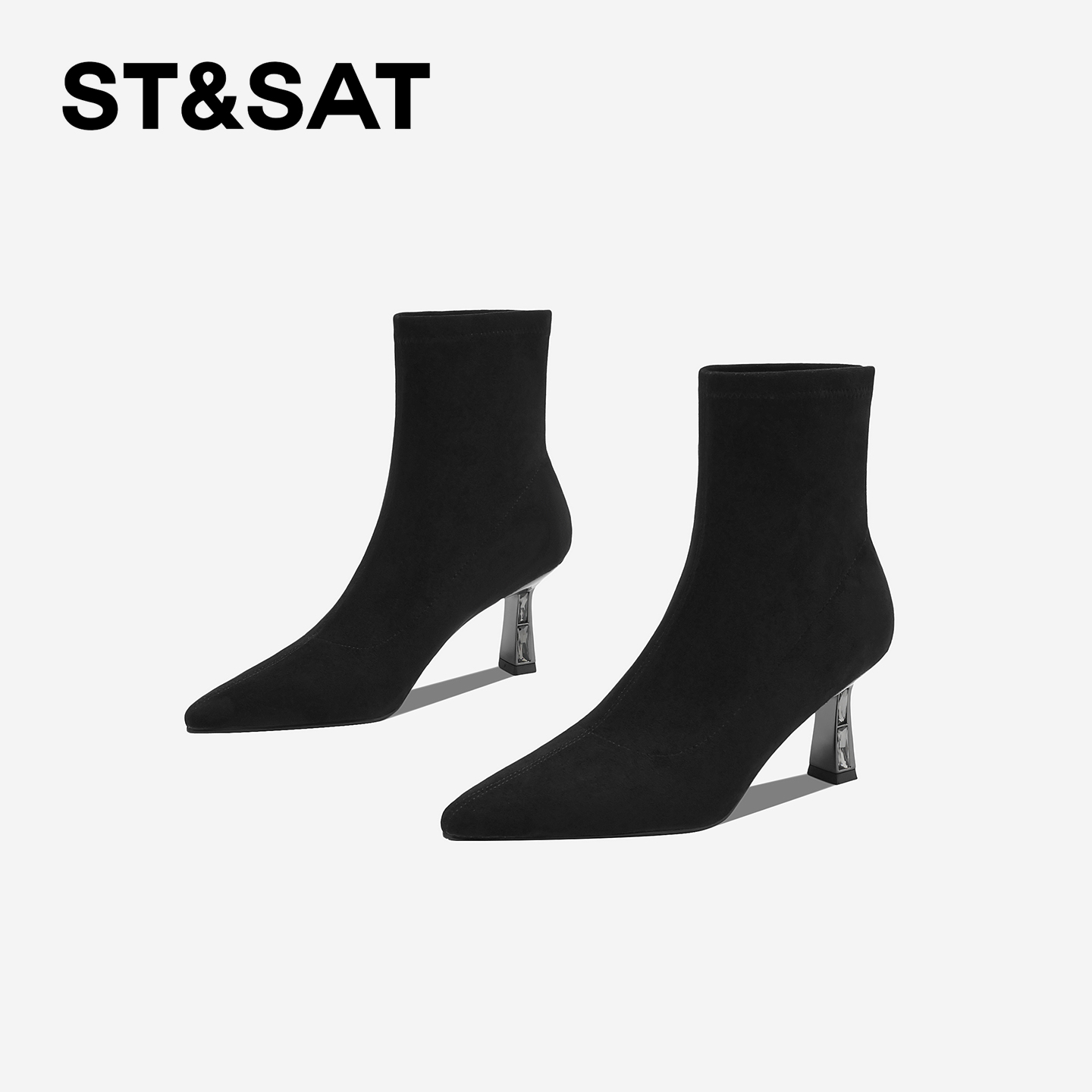 星期六高跟短靴女2025秋冬磨砂尖头细跟黑色短靴水钻弹力靴时装靴