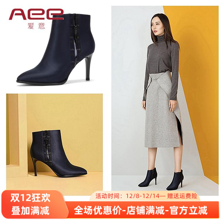 Aee/爱意织物1617505013侧拉链时装靴尖头细高跟短靴女秋冬