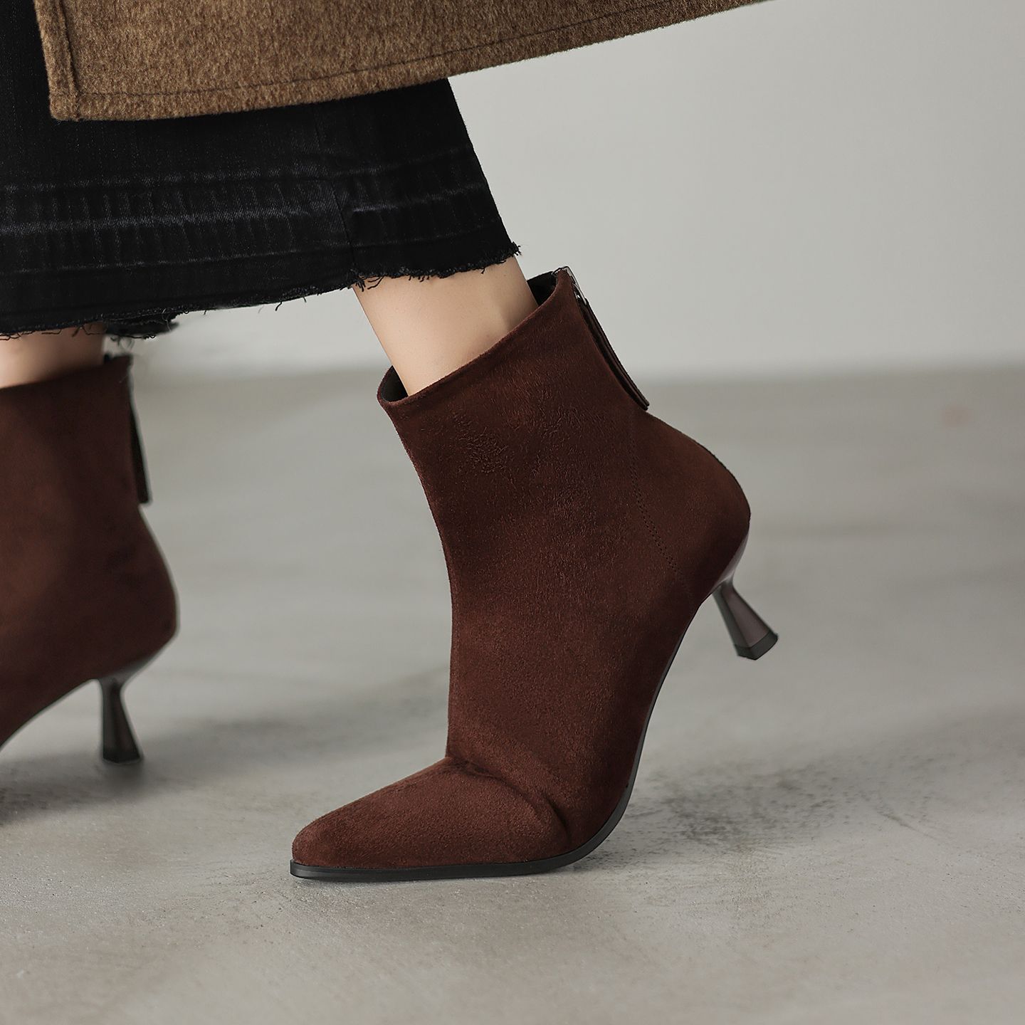 7.5cm2025新款尖头细高跟短靴女秋冬拉链绒面弹力瘦瘦靴马丁靴