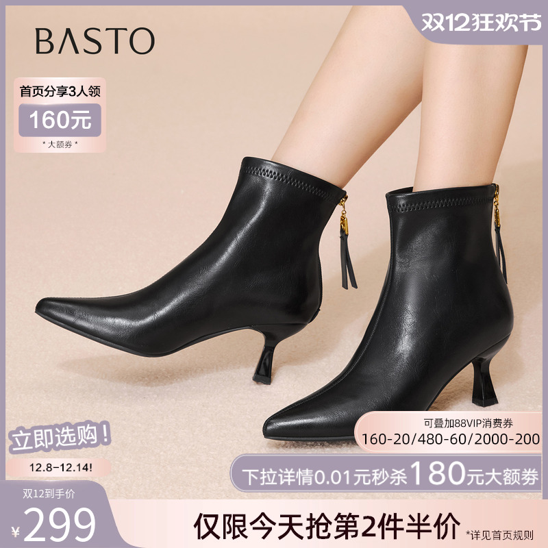 百思图2025冬季新款法式气质通勤细高跟鞋尖头女黑色短靴F5303DZ5