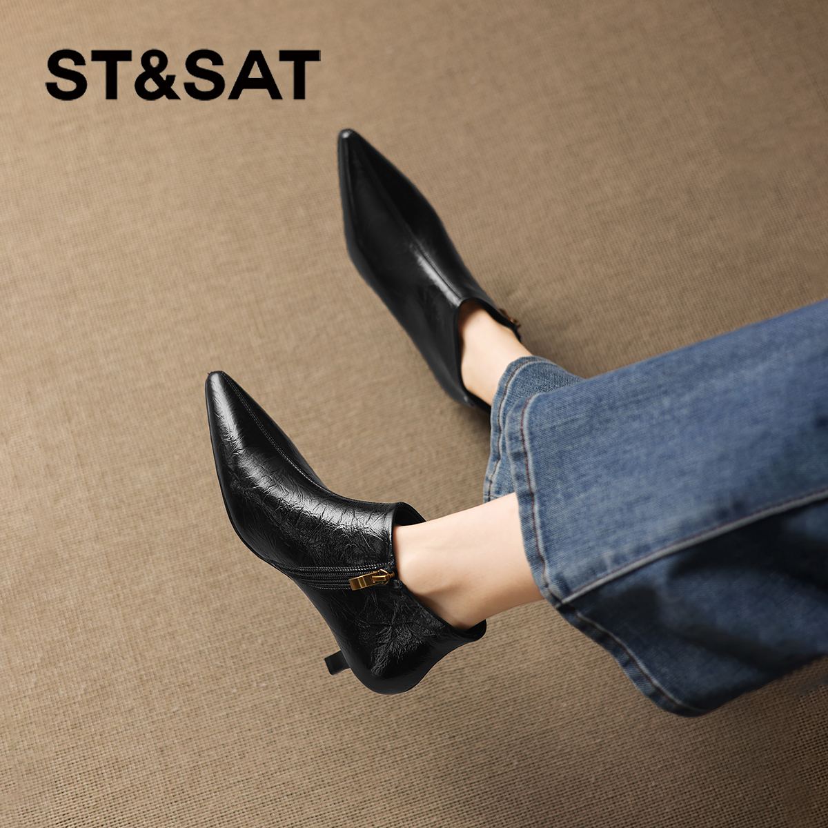St&Sat/星期六秋冬牛皮金属扣侧拉链尖头细高跟短靴女SS14116663