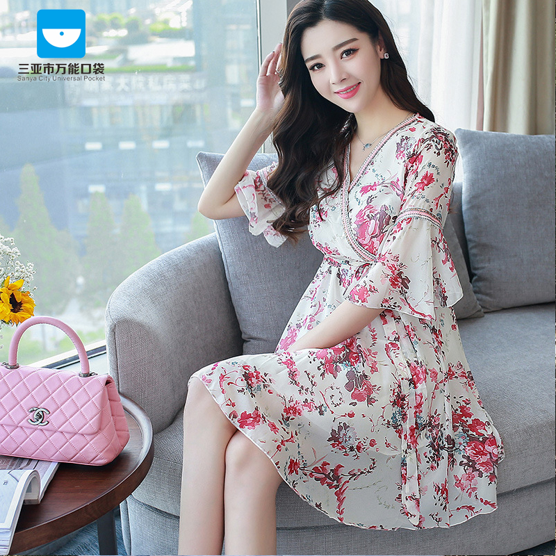 三亚-海边度假女夏2022新款波西米亚长裙中长款碎花雪纺连衣裙