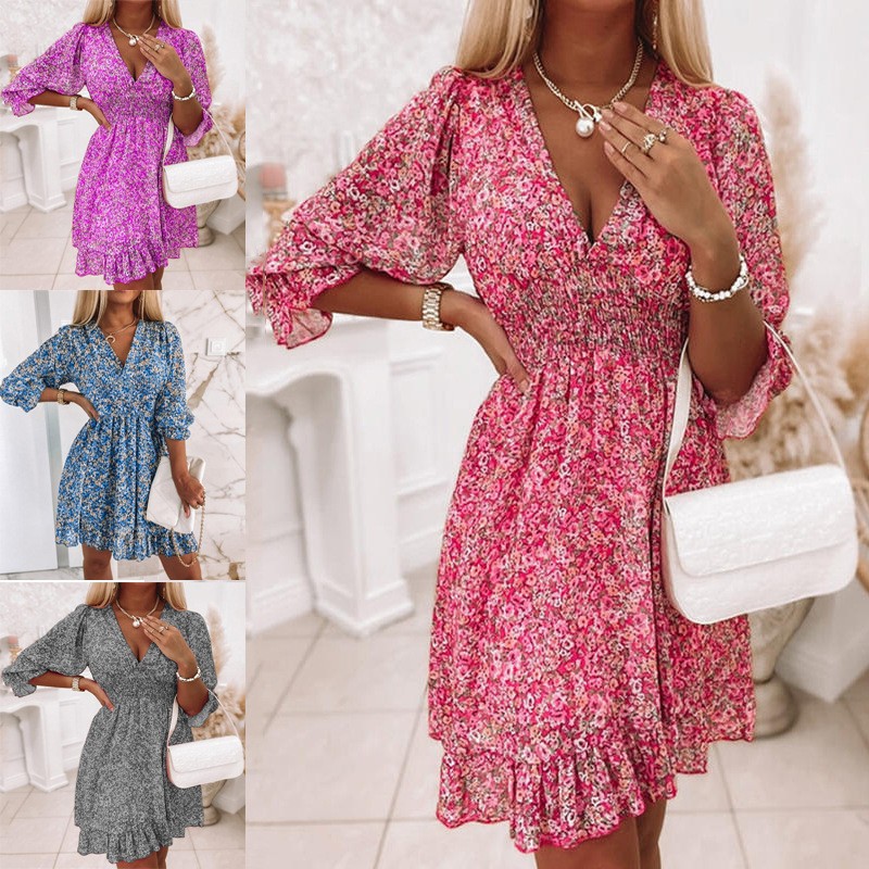 夏季波西米亚V领收腰系带印花百褶荷叶短袖大摆中长款连衣裙DRESS