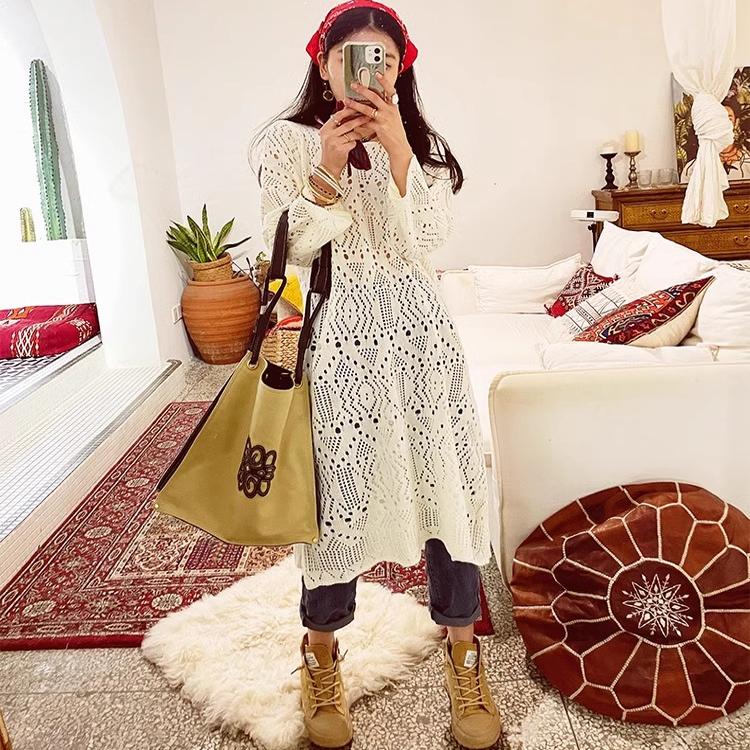 镂空长袖宽松白色针织连衣裙女秋季波西米亚慵懒风中长款罩衫上衣