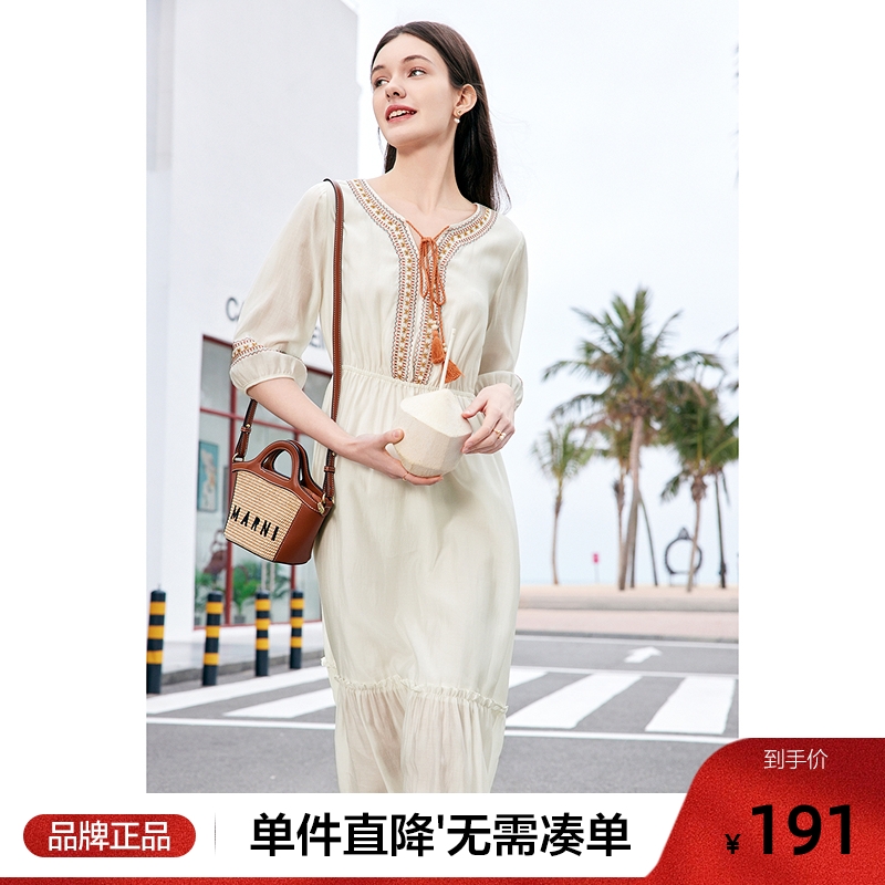 拉夏贝尔/La Chapelle波西米亚刺绣连衣裙女秋新款气质中长款裙子