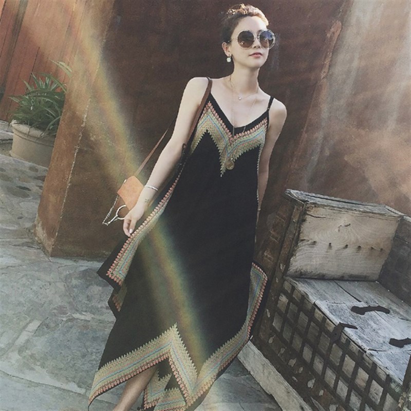 商场同款北欧时刻法式复古波西米亚风连衣裙女夏季吊带裙中长裙子