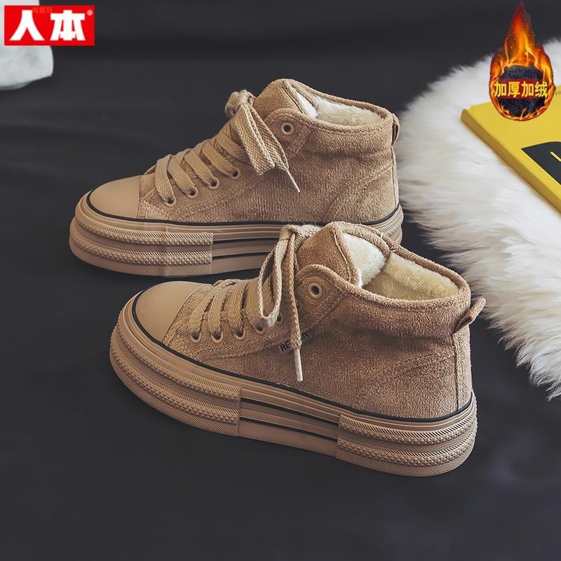 人本高帮棉鞋女冬季2024韩版百搭加厚加绒厚底帆布鞋女板鞋子保暖