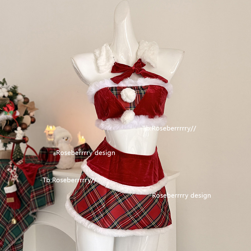 Roseberrrry甜绒麋鹿 圣诞节红格cos套装纯欲性感抹胸丝绒连衣裙