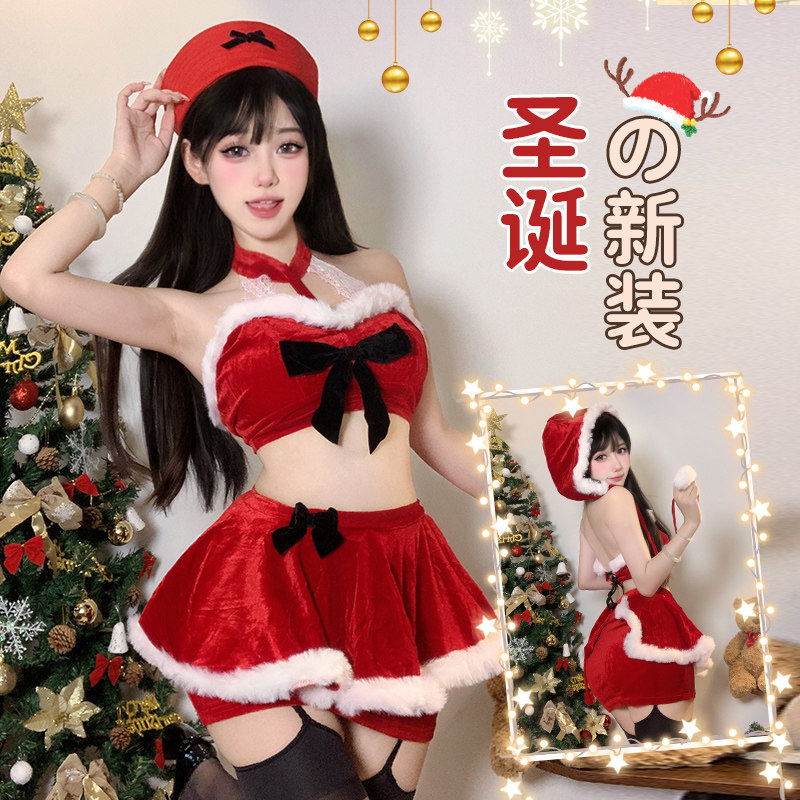 恶魔大人新款情趣甜辣妹圣诞战袍红色帽子性感挂脖蝴蝶结cos套装