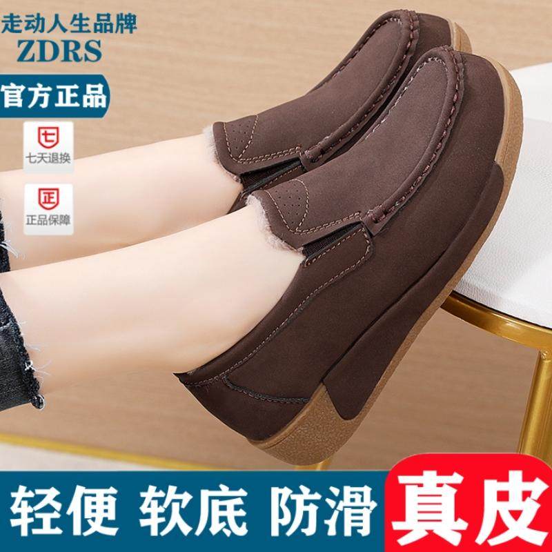 2026秋冬新款加绒单鞋厚底豆豆鞋松糕鞋坡跟真皮摇摇鞋棉鞋妈妈鞋