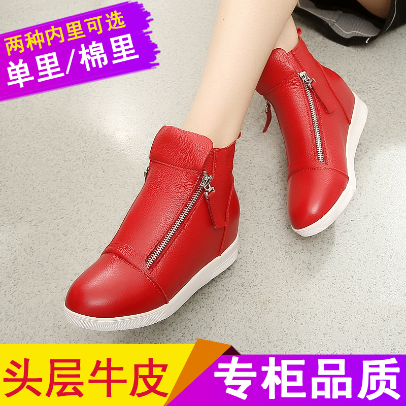 真皮新款内增高女鞋子平底休闲单鞋加绒中跟棉鞋秋冬拉链高帮皮鞋