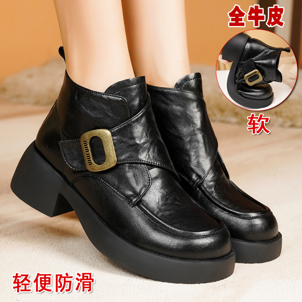 全牛皮马丁靴女2025秋冬新款平跟厚底软皮女单鞋高帮休闲加绒短靴