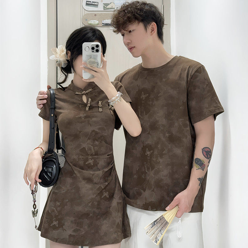 情侣装夏季新中式套装花色旗袍女短袖半身裙男套装盘扣学生班服潮