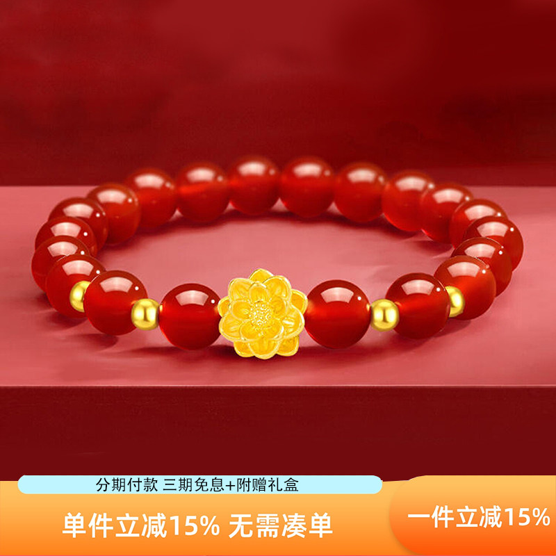 黄金莲花转运珠手链女单圈天然红玛瑙黄金手串送妈妈手镯新款礼物