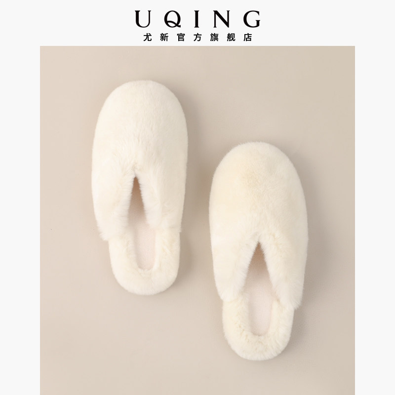 潮牌新款保暖平底拖鞋女 静音木地板居家防滑兔毛时尚开口棉拖鞋