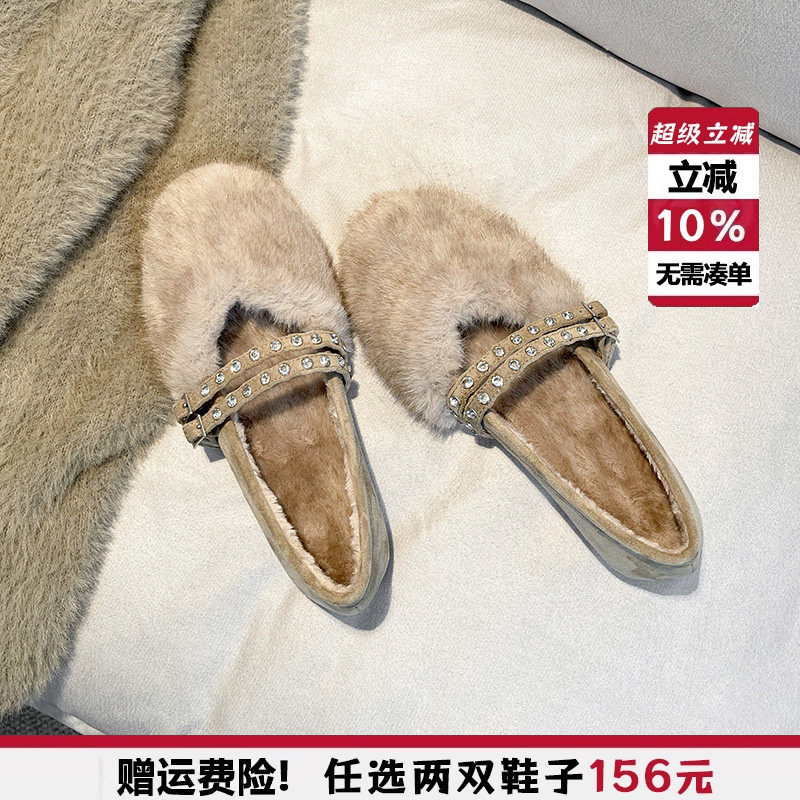 毛毛鞋女外穿2025新款秋冬季软底平底水钻单鞋兔毛加绒方头豆豆鞋