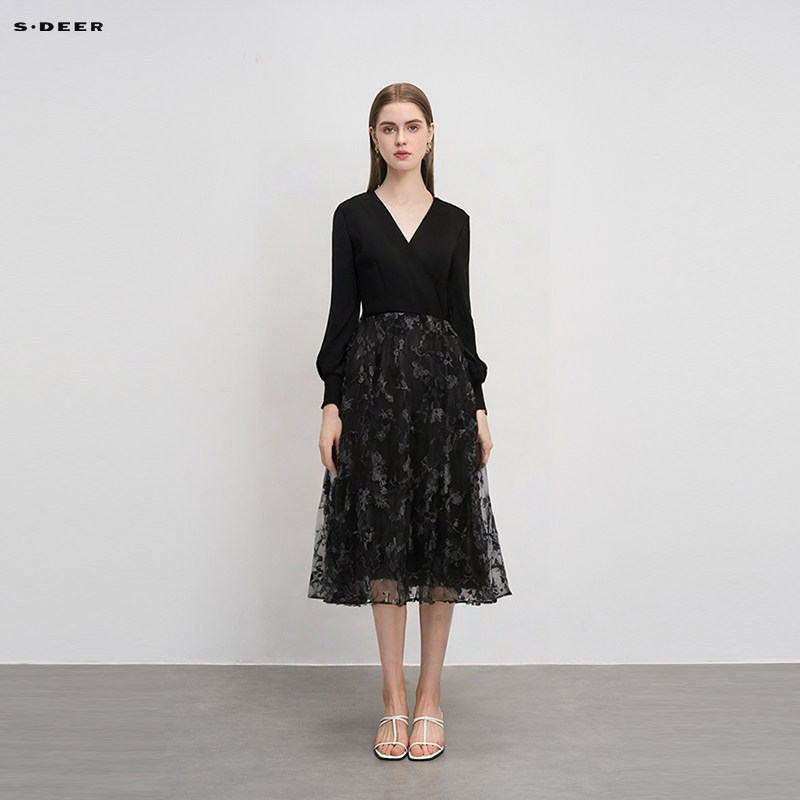 sdeer圣迪奥春装女装圆领收腰拼接网纱优雅连衣裙S241Z1205