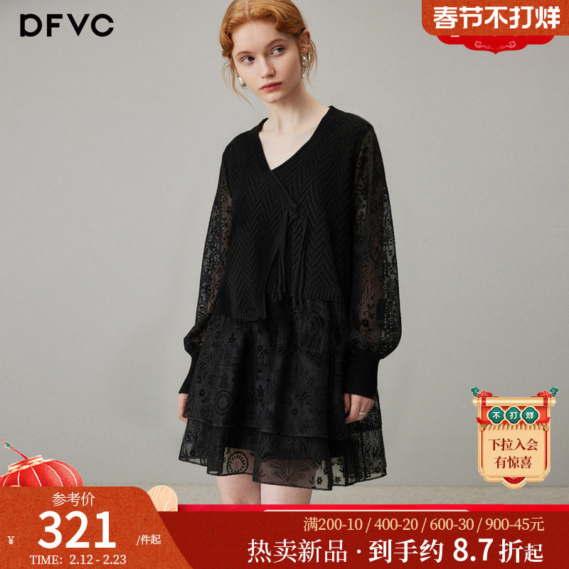 dfvc洋气针织拼接春装连衣裙女2026年春季新款荷叶边提花宽松裙子