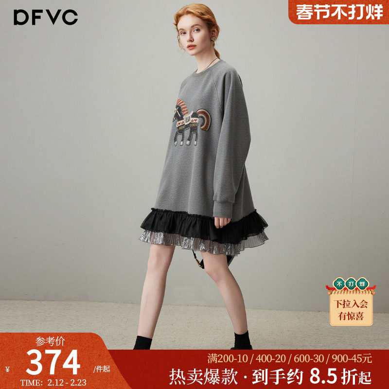 dfvc灰色休闲圆领卫衣裙女2026年春季新款小马刺绣宽松春装连衣裙