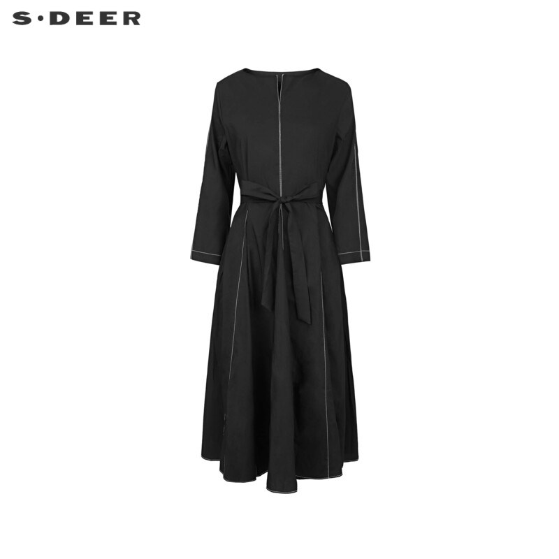 sdeer圣迪奥春装女装复古V领撞色收腰七分袖连衣裙S241Z1297