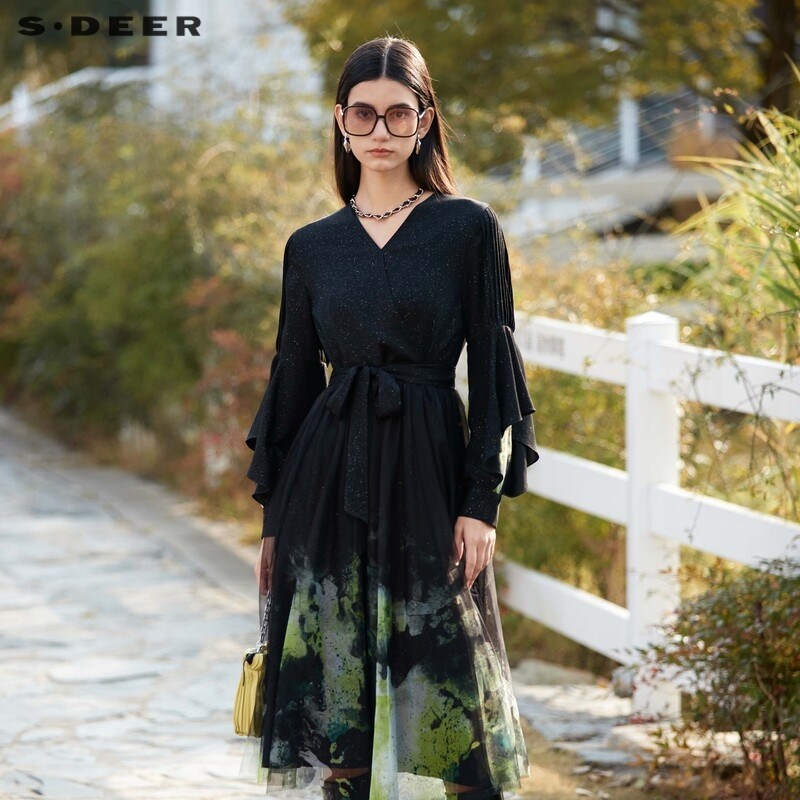 sdeer圣迪奥春装女装文艺风V领收腰网纱晕染连衣裙S24161207