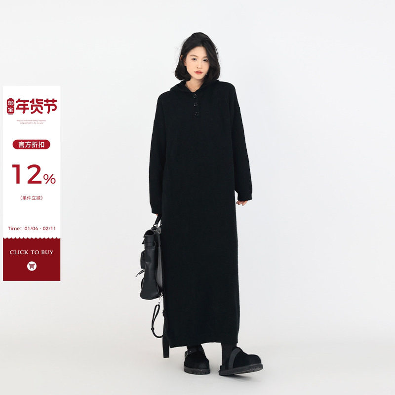 吴童童 长款针织毛衣连帽连衣裙女秋冬韩系直筒宽松简约百搭长裙