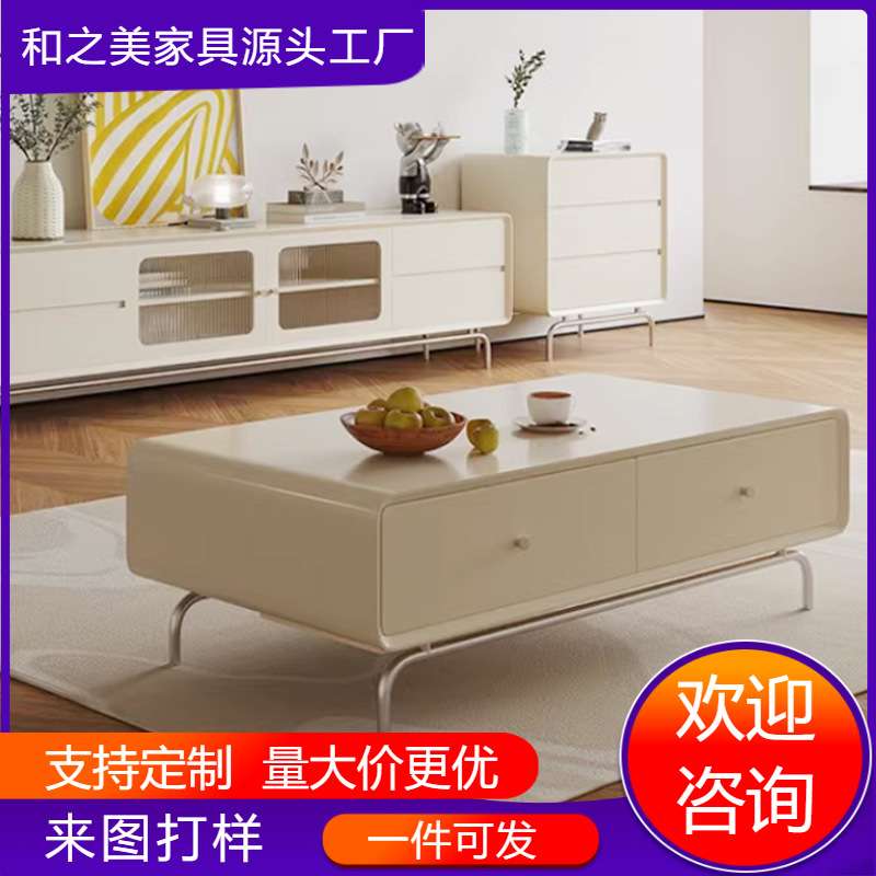 北欧茶几电视柜组合简约现代客厅茶桌奶油风实木白色烤漆储物茶台