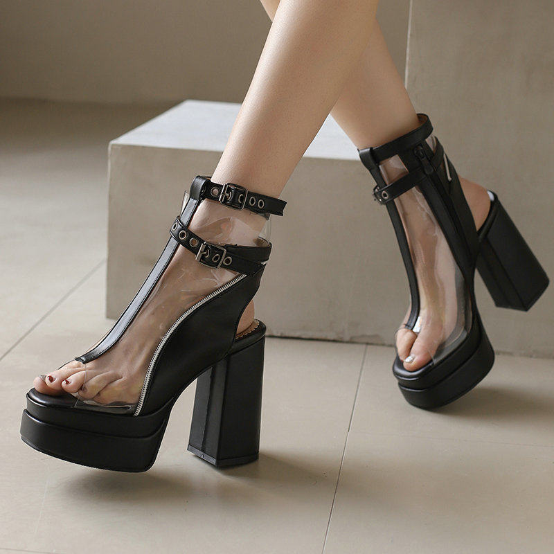 春夏新款透明欧美12cm粗跟夜店模特性感舞台短靴露趾高跟鞋方头女