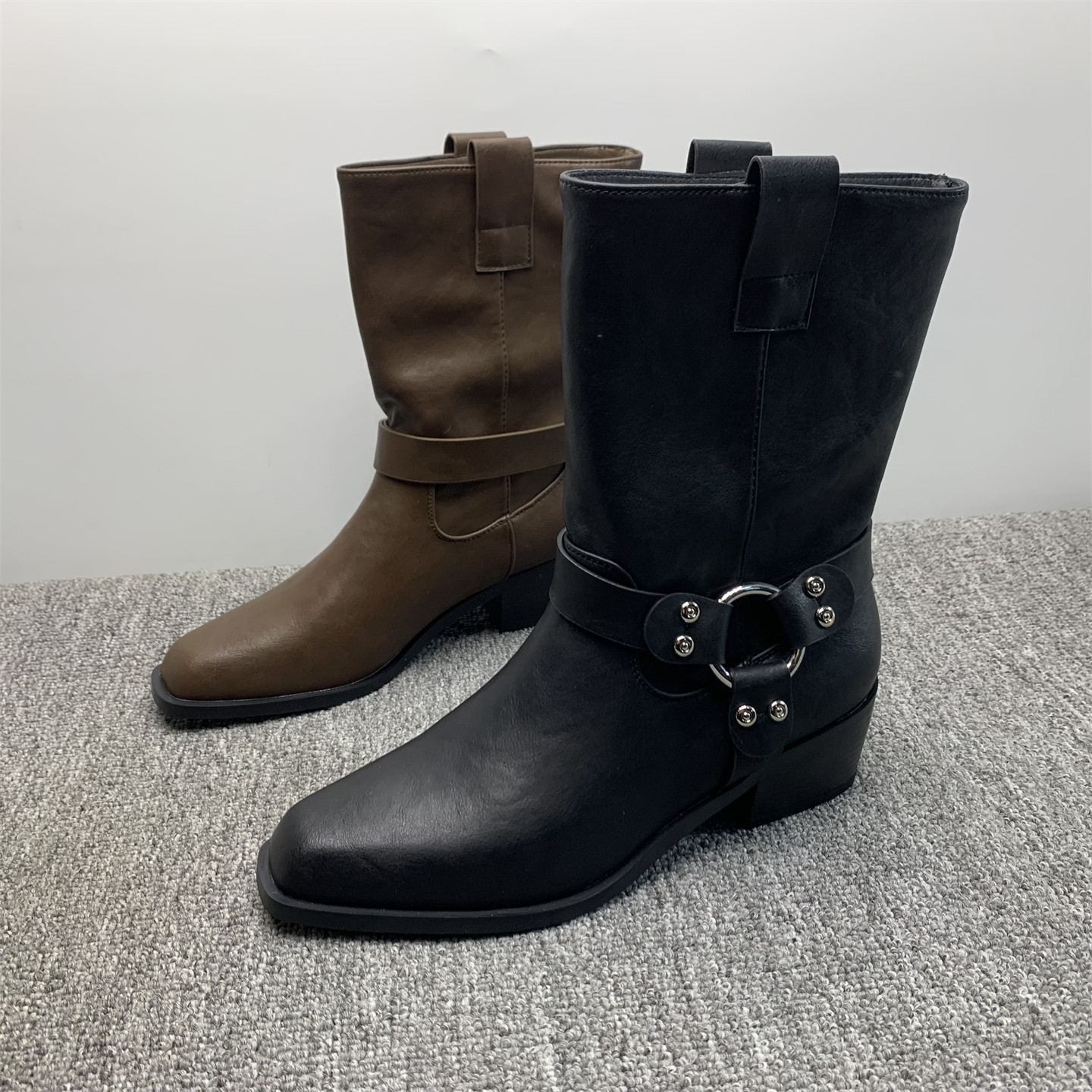 品牌撤柜处理方头粗跟中筒时装靴女2025秋冬新款英伦风复古西部靴