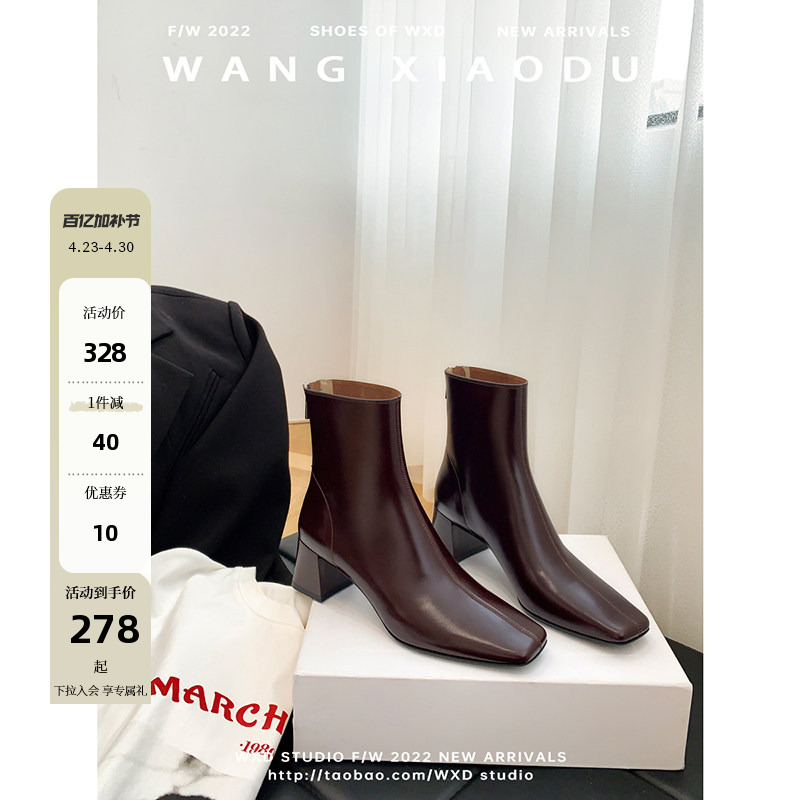 【王小毒】Z时代●真皮及裸袜靴短靴女粗高跟新款方头加绒瘦瘦靴