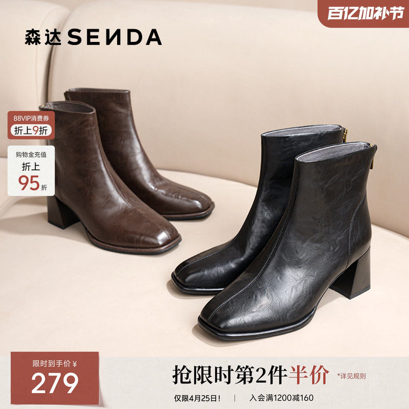 星期六棕色时装靴女2025秋冬方头粗跟后拉链短靴真皮英伦切尔西靴