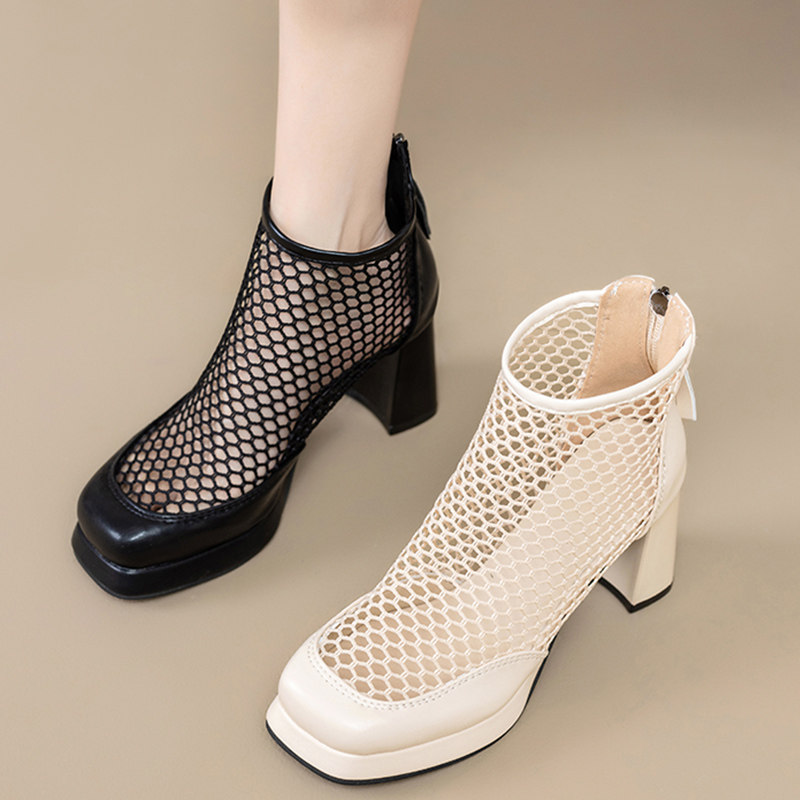 网靴女镂空粗跟网纱凉鞋2026年夏季新款黑色方头高跟短靴透气凉靴