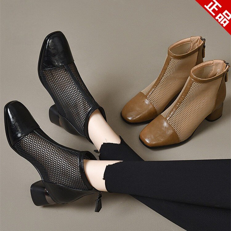 2025春秋新款真皮网靴方头粗跟低跟短靴透气网鞋镂空凉靴H158-126