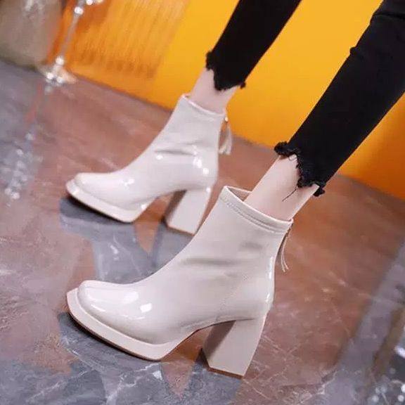 高级感!炸街小短靴洋气辣妹风黑色漆皮方头粗跟厚底马丁靴瘦瘦靴