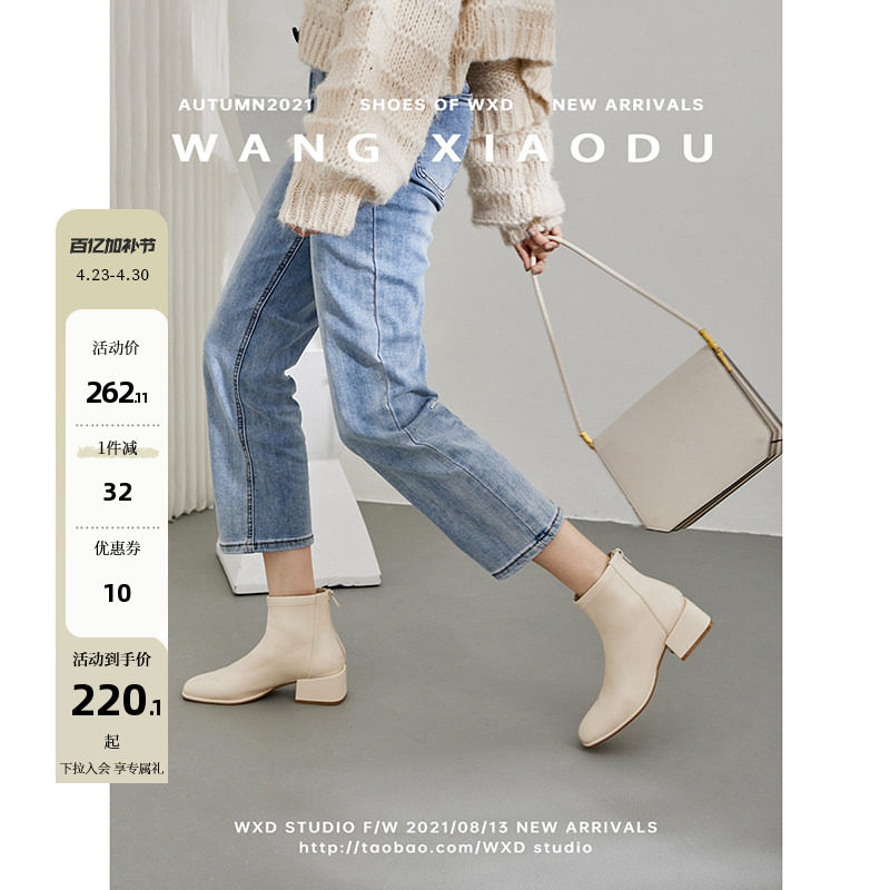 软皮中跟米色小短靴女2026新款春秋百搭马丁靴时尚方头粗跟瘦瘦靴