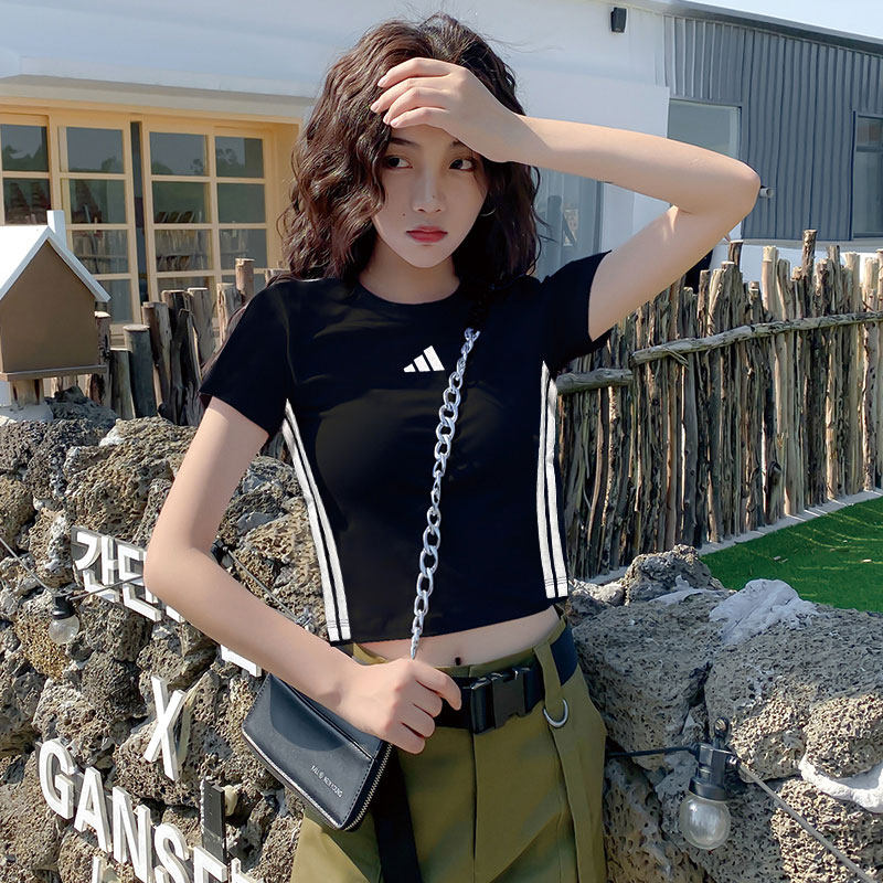 阿迪达斯短袖女夏季新款短款上衣修身辣妹运动半袖黑色T恤JY8571