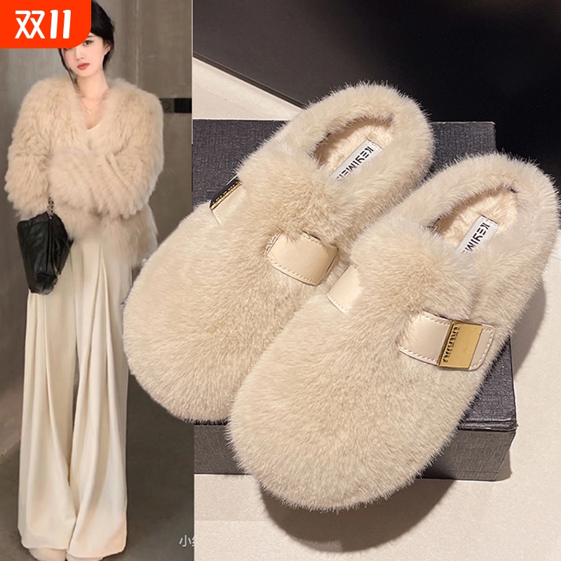法式水貂毛平底毛毛鞋女外穿2025新款秋冬季一脚蹬毛绒棉鞋豆豆鞋