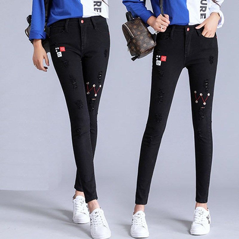 2025春秋新款牛仔裤女长裤真刺绣破洞紧身显瘦铅笔裤韩版弹力小脚
