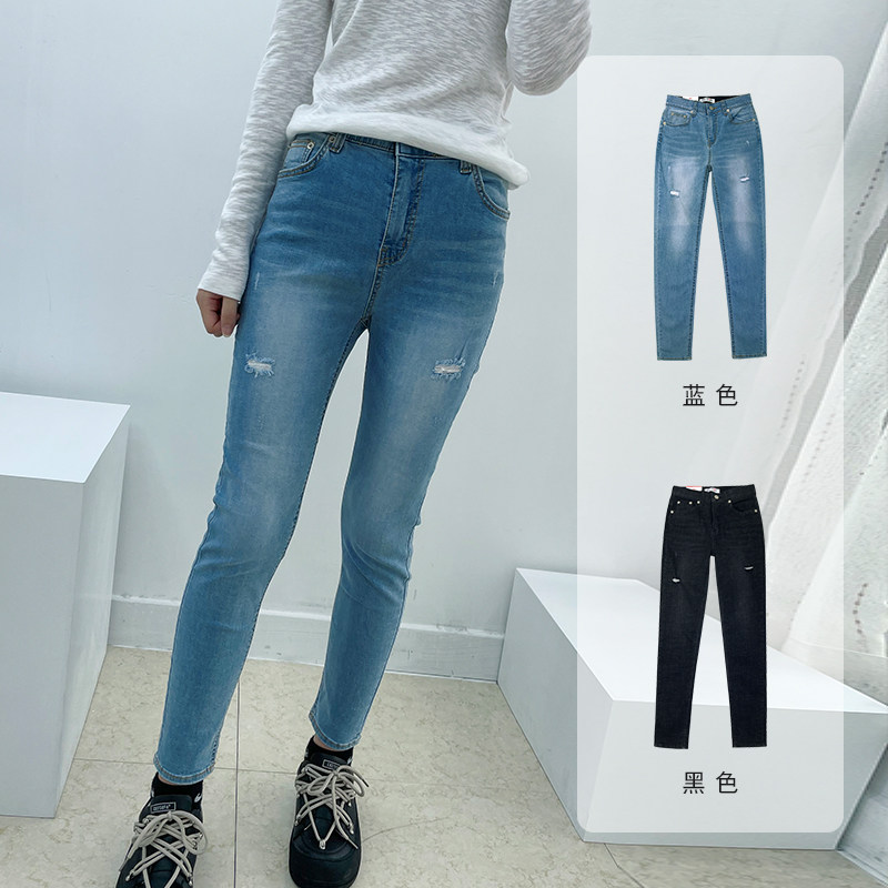 2021秋装破洞女式牛仔裤长裤薄款修身弹力显瘦学生小脚裤铅笔裤潮