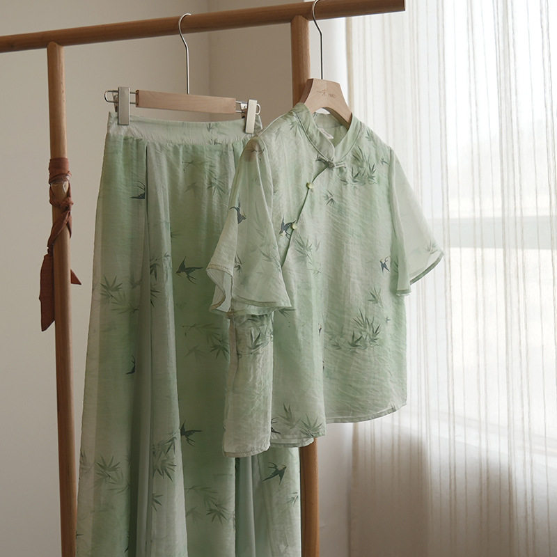 微笑向暖 复古新中式国风禅意两件套 文艺显瘦印花改良气质套装