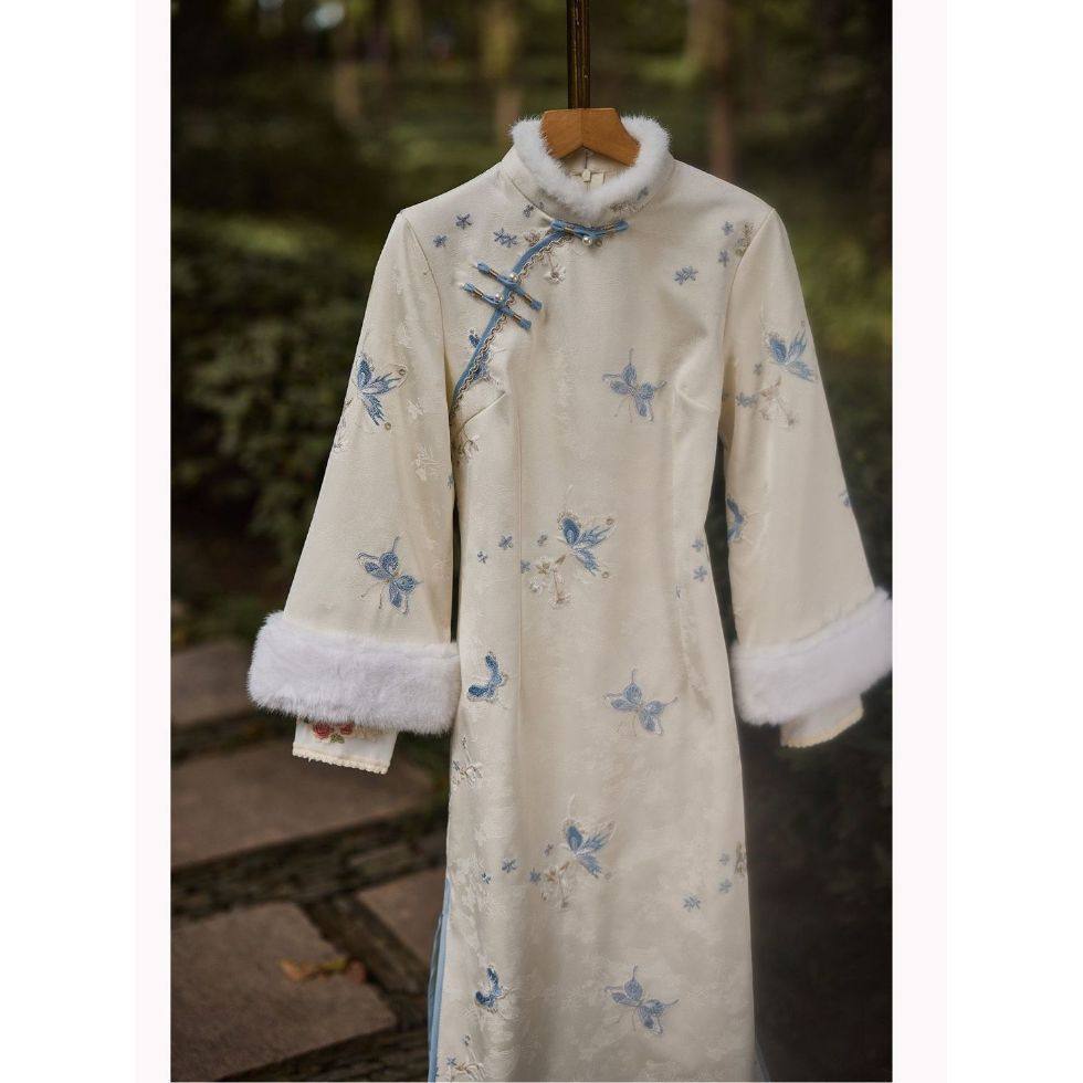 微笑向暖 蓝色新中式倒大袖旗袍女加绒加厚国风2025小个子连衣裙