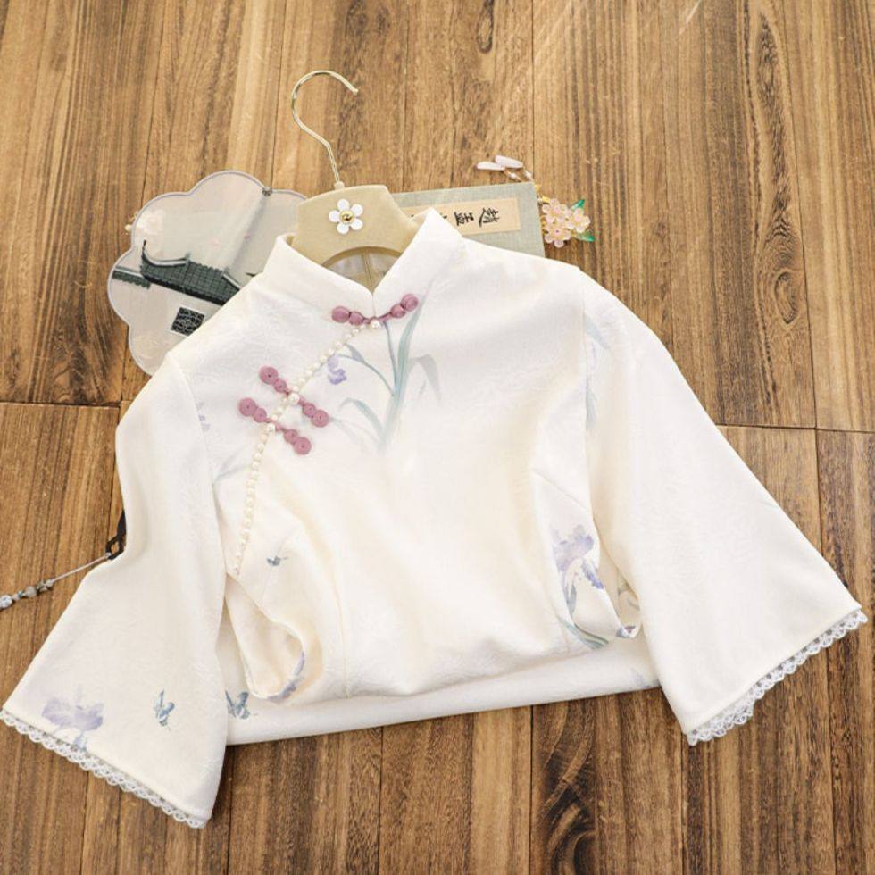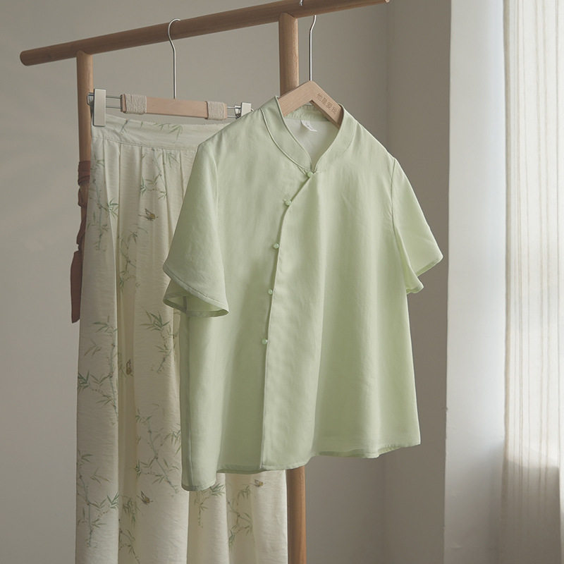 微笑向暖 新中式国风改良立领斜襟系带小衫 高腰宽松显瘦裤裙套装