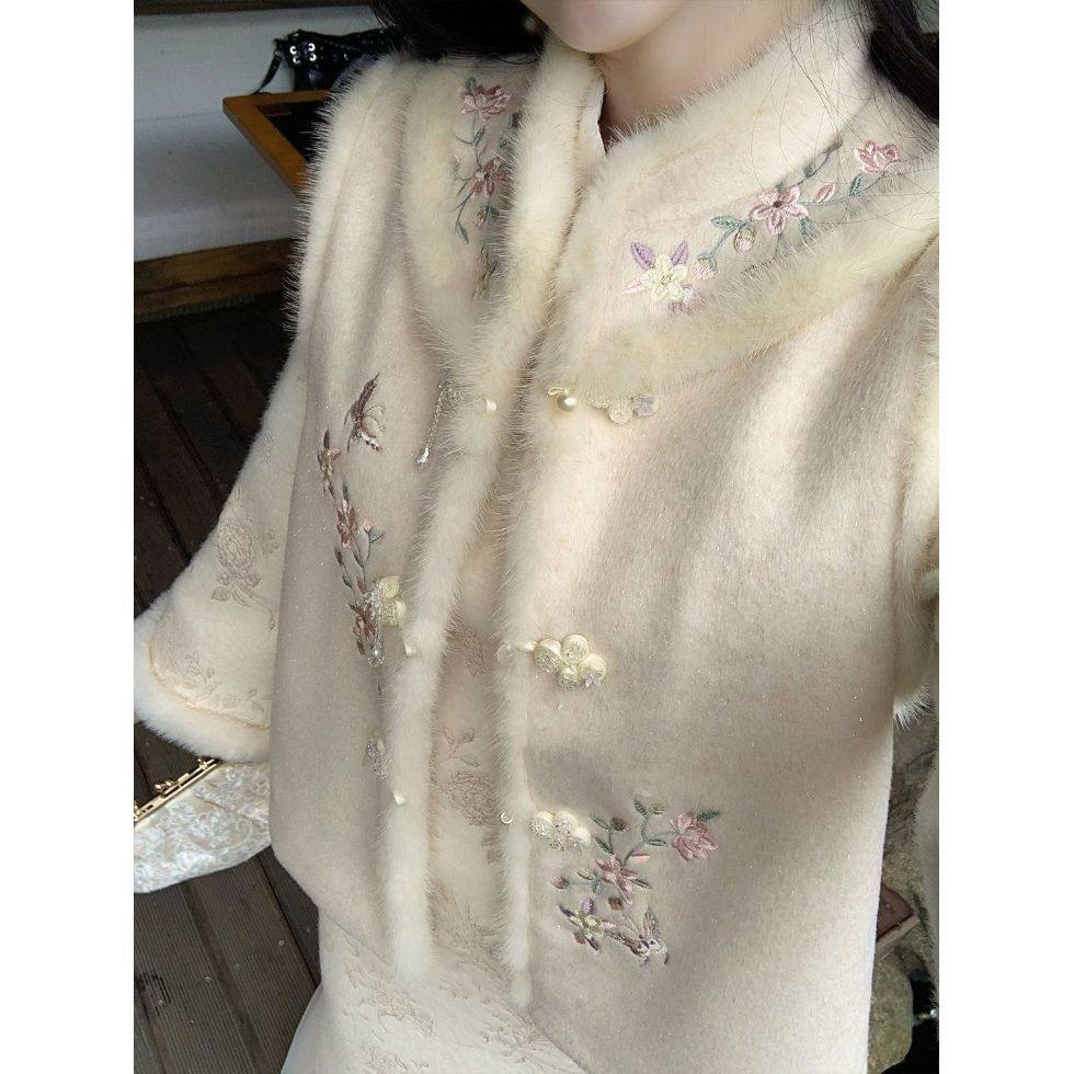 微笑向暖 国风拼接毛毛保暖背心两件套 新中式毛呢绣花加厚马甲