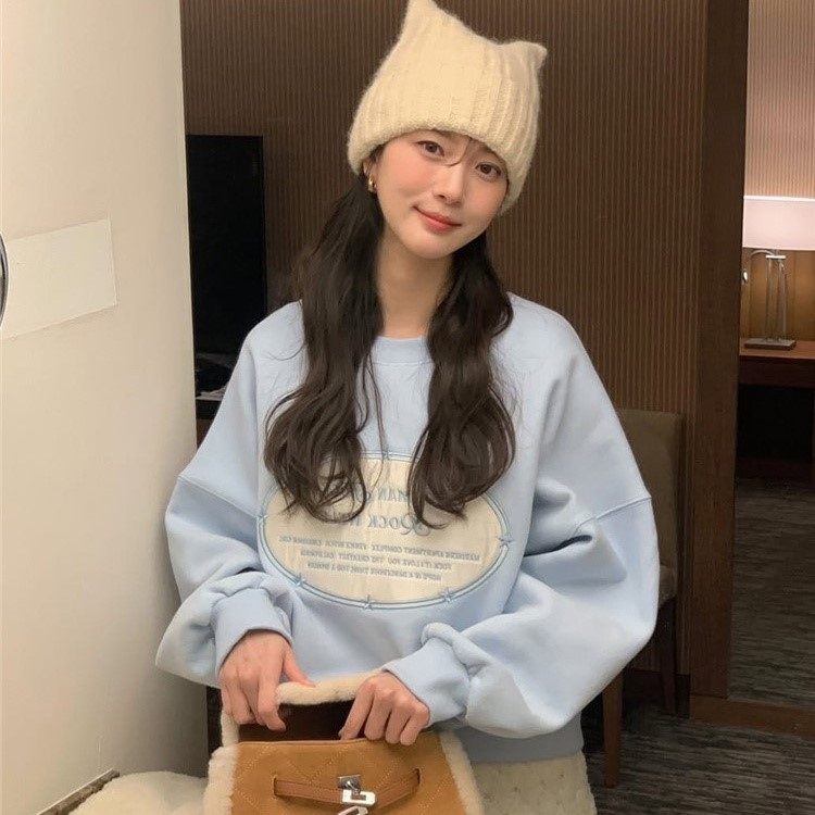 字母羊羔绒卫衣女宽松版套头长袖加绒上衣羊羔毛外套学生外穿穿搭