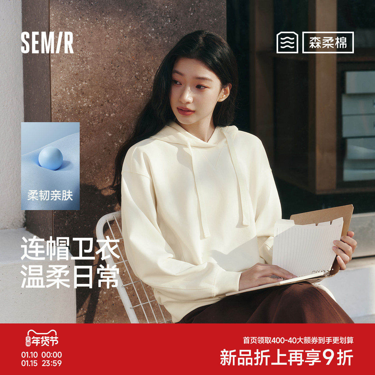 森柔|森马卫衣女春季绣花连帽宽松分割上衣女生简约温柔系套头衫