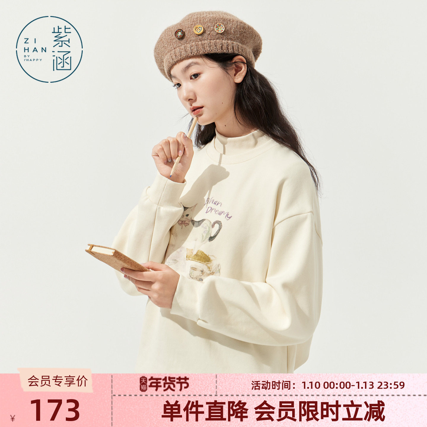 紫涵圆领套头卫衣女2025年冬季新款猫咪印花加绒保暖宽松休闲上衣