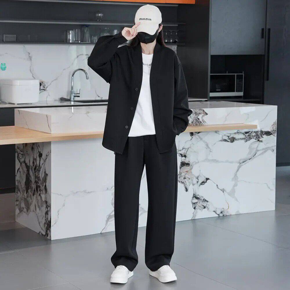 秋季新款简约风百搭时尚宽松个性复古慵懒感开衫长裤套装男女同款