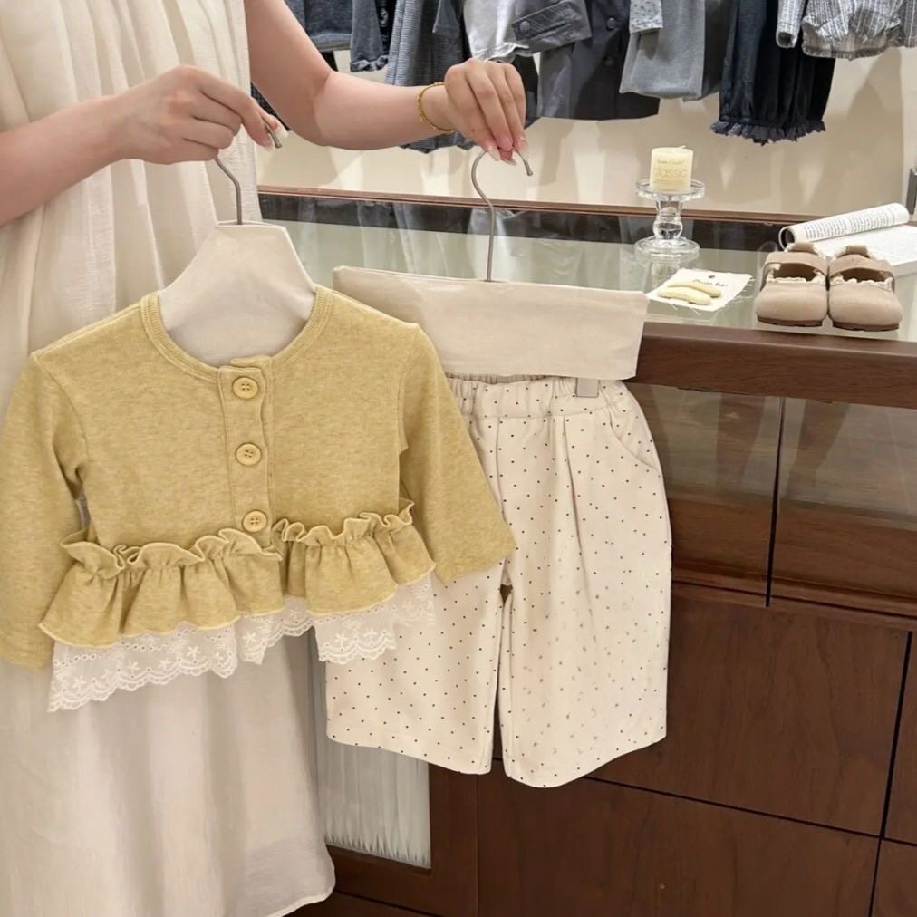 2025原创!女童公主风秋季新款韩版套装洋气花边开衫外套波点长裤