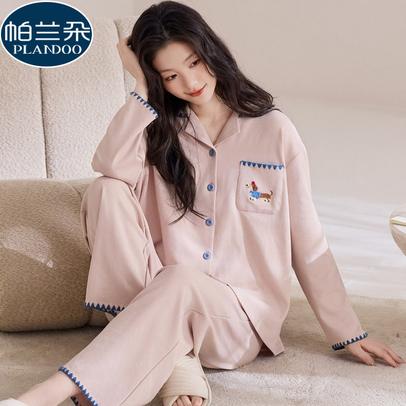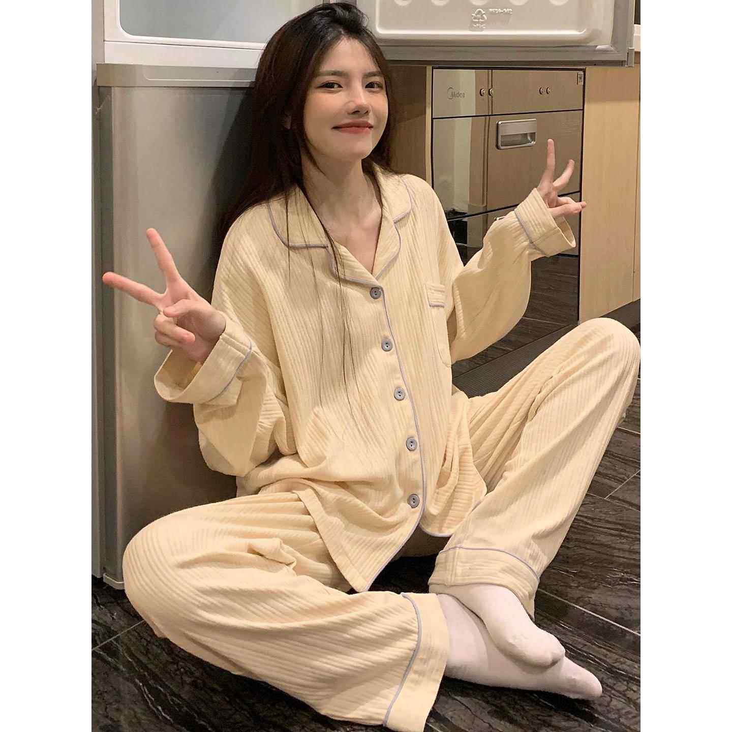 悦内睡衣女春秋款秋季纯棉长袖长裤家居服时尚大码开衫可外穿套装
