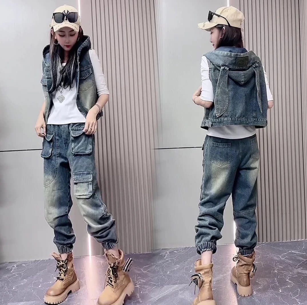 春秋季无袖连帽兔耳朵马甲上衣长裤两件套女宽松大码时尚牛仔套装
